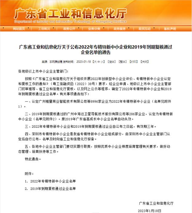 2023年1月18日,广东省工业和信息化厅正式公布2022年专精特新中小企业入选名单,广州安凯微电子股份有限公司榜上有名。