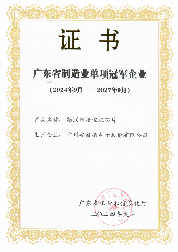 近日,安凯微(股票代码:688620)收到由广东省工业和信息化厅颁发的《广东省制造业单项冠军》证书。2024年7月26日至8月5日广东省工信厅对拟入选2024年省级制造业单项冠军的企业名单予以公示,安凯微凭借“物联网摄像机芯片”的技术创新及优秀的市场表现成功入选。