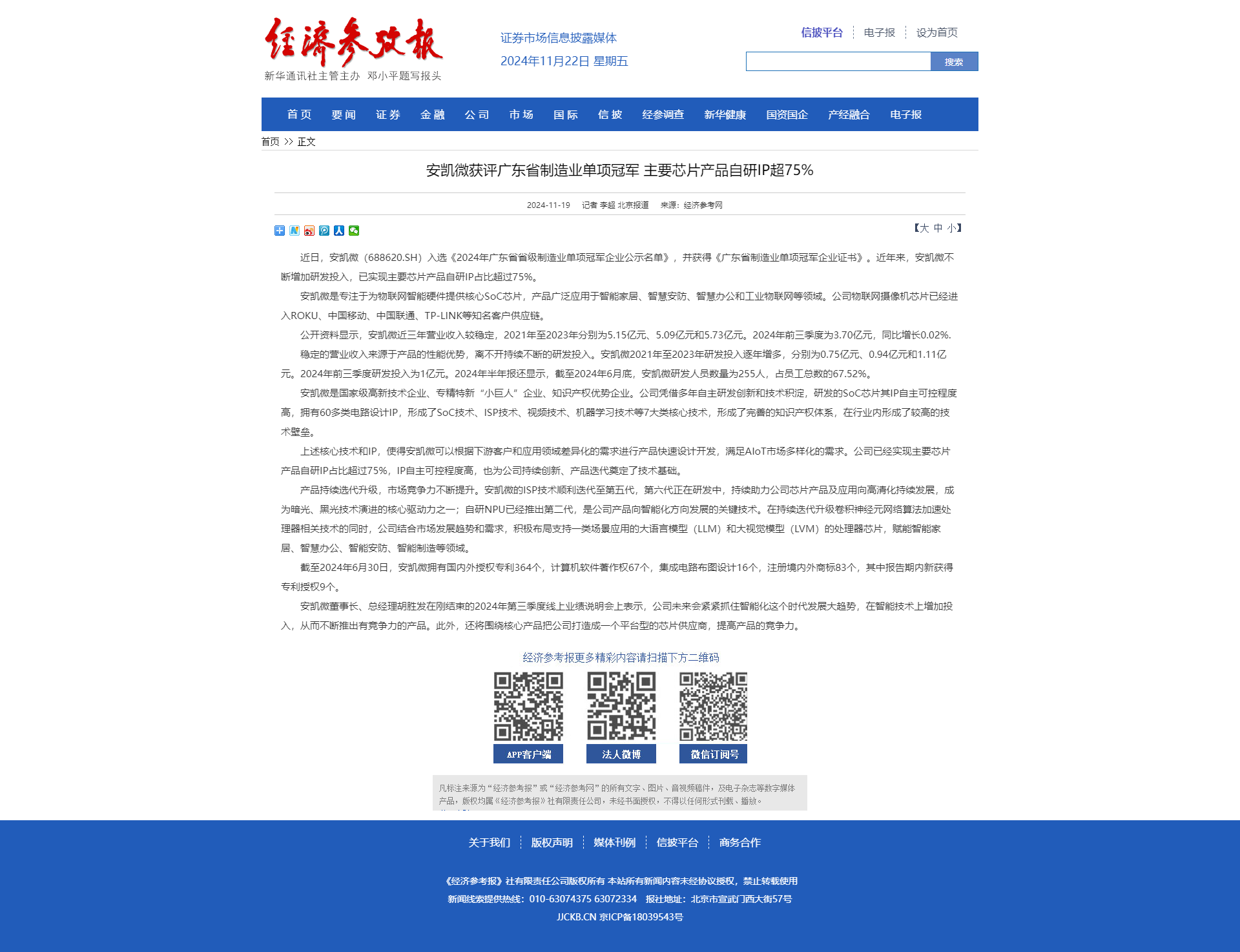 安凯微获评广东省制造业单项冠军 主要芯片产品自研IP超75%